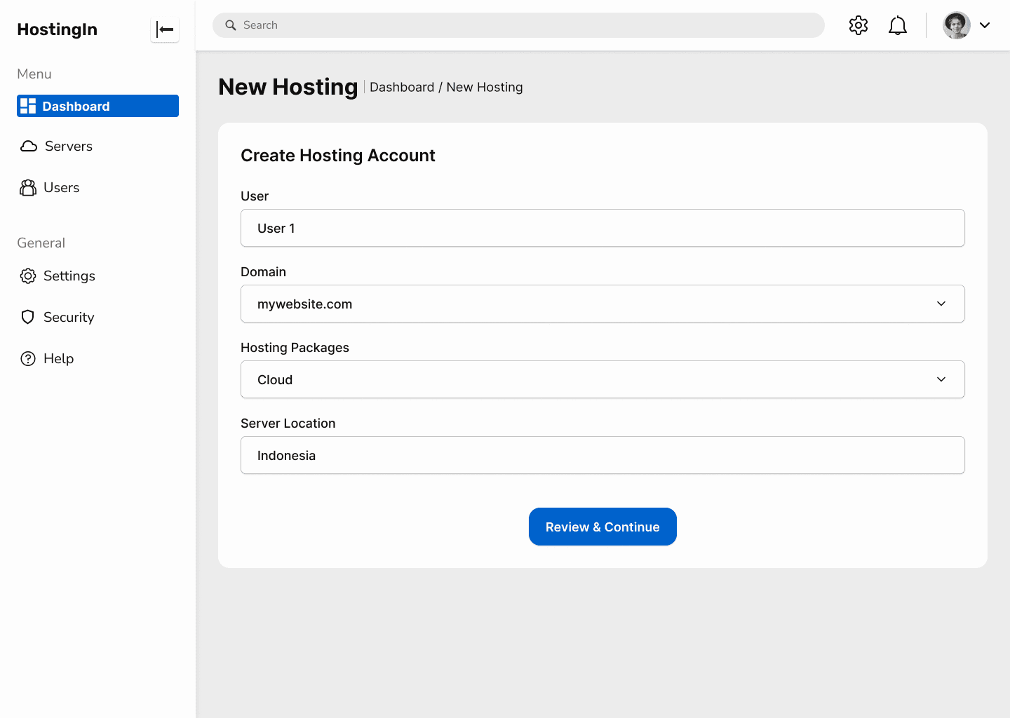 New Hosting is designed to simplify the process of creating a hosting account by allowing users to input domain, select hosting packages, and choose server locations seamlessly.