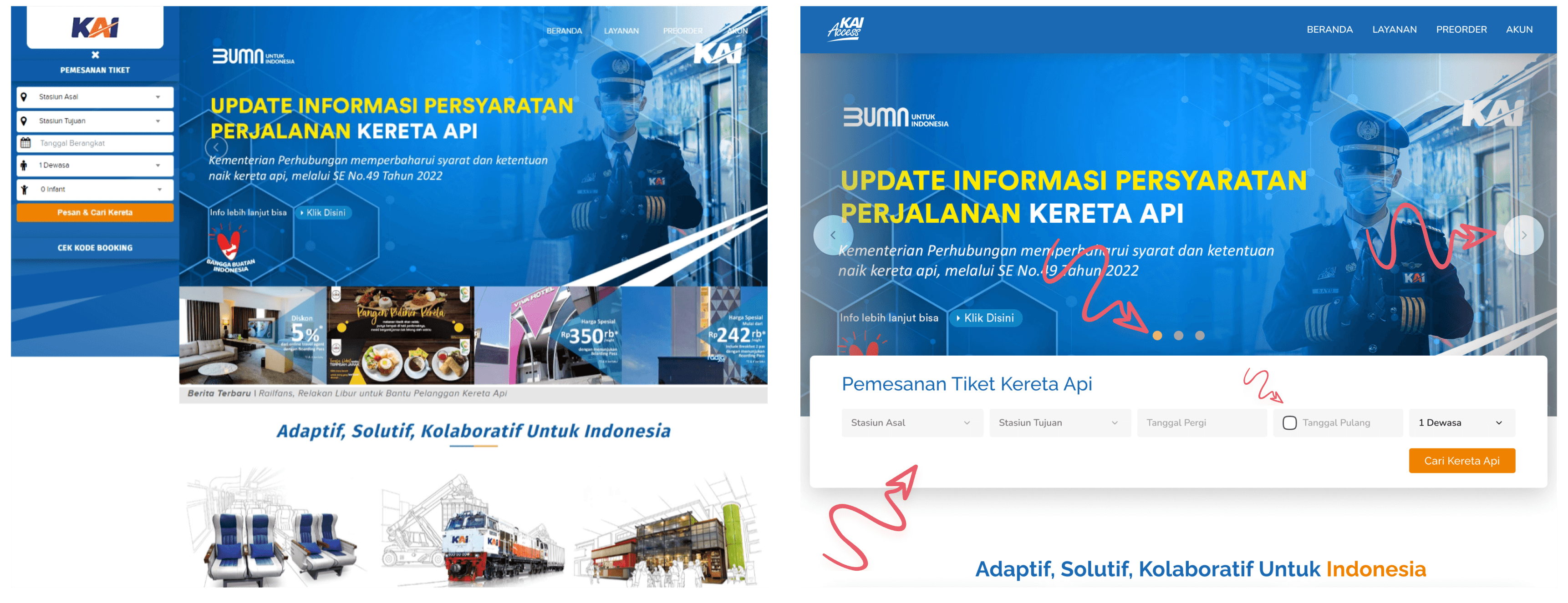 The main challenges in redesigning the KAI Access website revolve around improving visual hierarchy in filter features and train ticket displays, making error messages clearer and seat selection more informative, and refining the passenger data entry flow for better usability. The key issue is balancing clarity and functionality within a limited screen space while ensuring any changes don’t confuse existing users