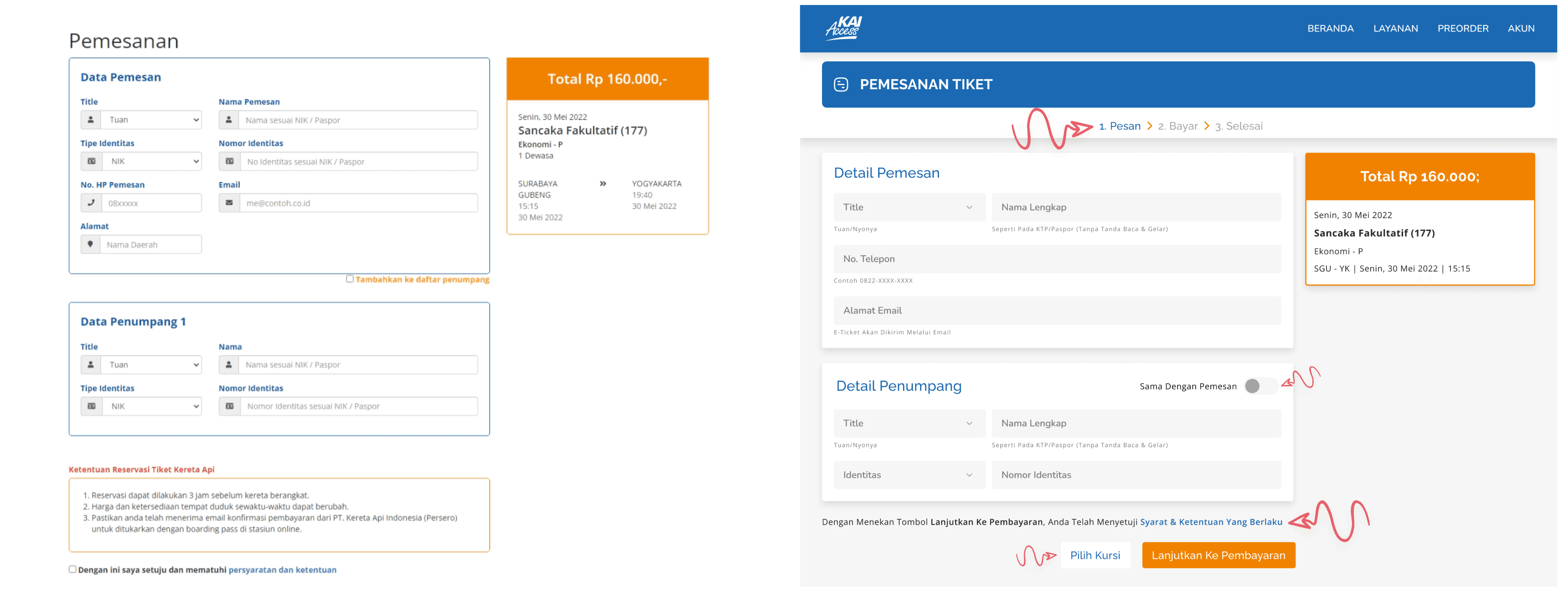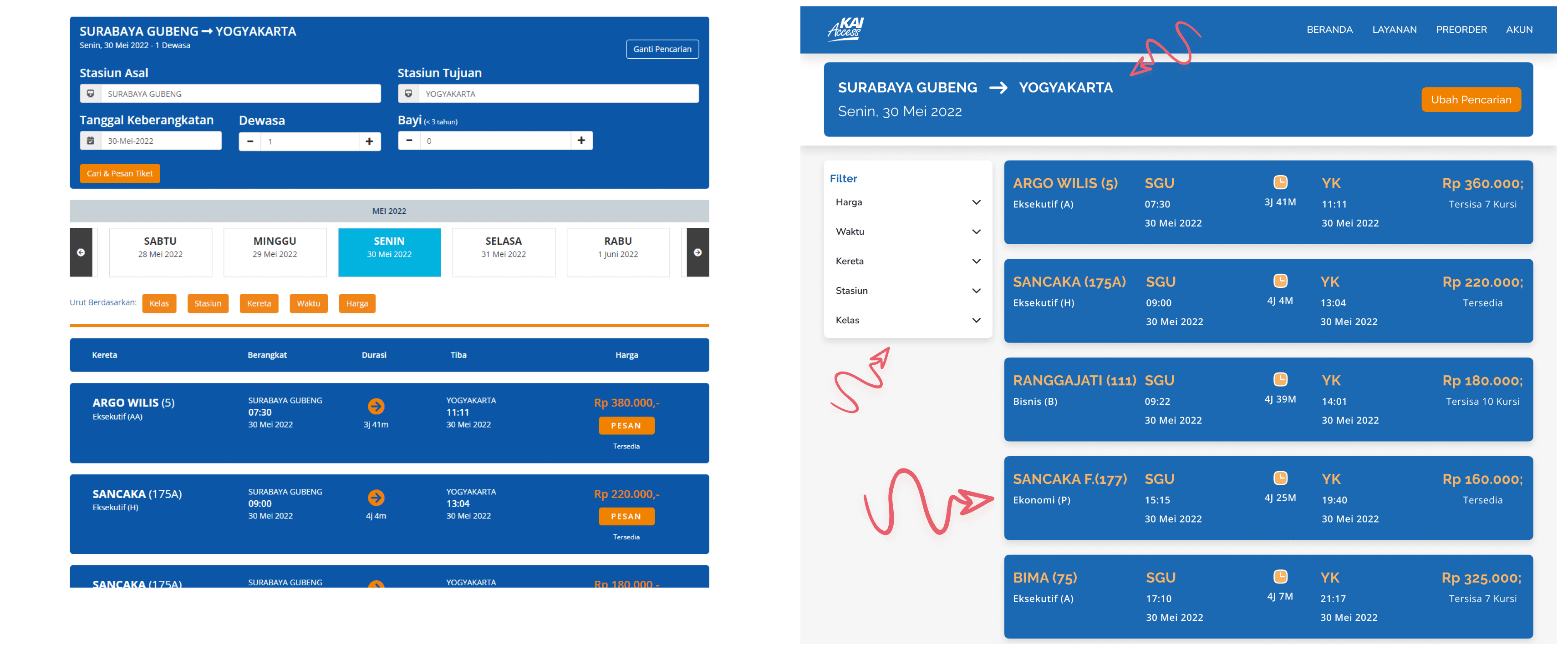 Some key issues with the current KAI Access website design include the lack of intuitive sorting, forcing users to read each card's details since the system only sorts by departure time, even when using filters like price. Additionally, users tend to click directly on the seat in the carriage because the passenger box doesn’t look like a button that needs to be clicked first. Another challenge is that checkboxes are not immediately clear, making users take longer to find and understand their function.